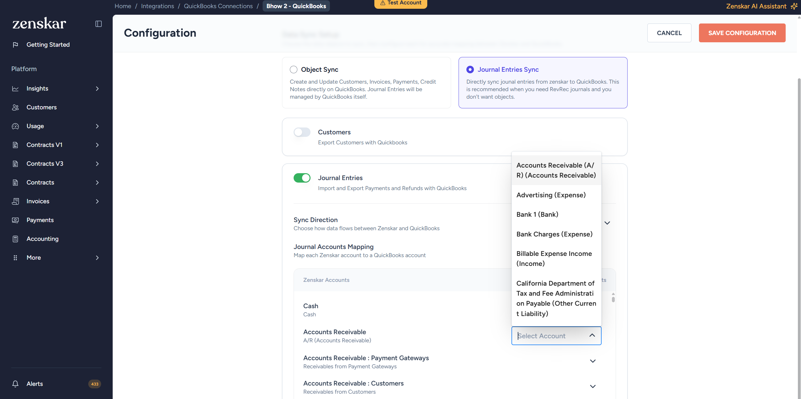 - Journal Accounts Mapping: Maps each Zenskar account (e.g., Accounts Receivable, Revenue, Cash, Tax Withheld) to a corresponding QuickBooks GL account. This ensures journal entry lines post to the correct accounts in your chart of accounts.