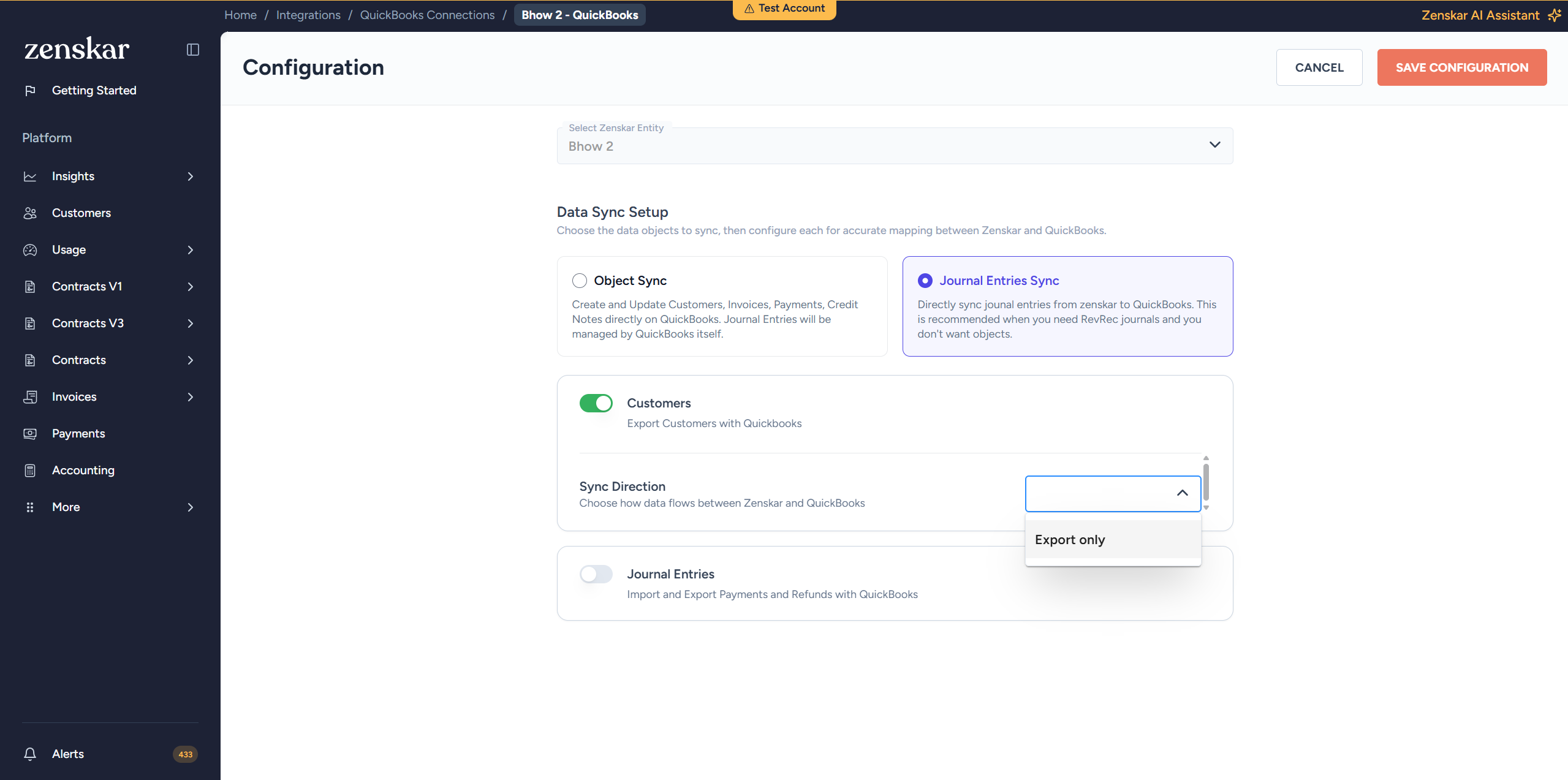 - Select the sync direction. Exports double-entry accounting transactions (e.g., revenue recognition, adjustments) from Zenskar to QuickBooks as Journal Entries with debit and credit lines.