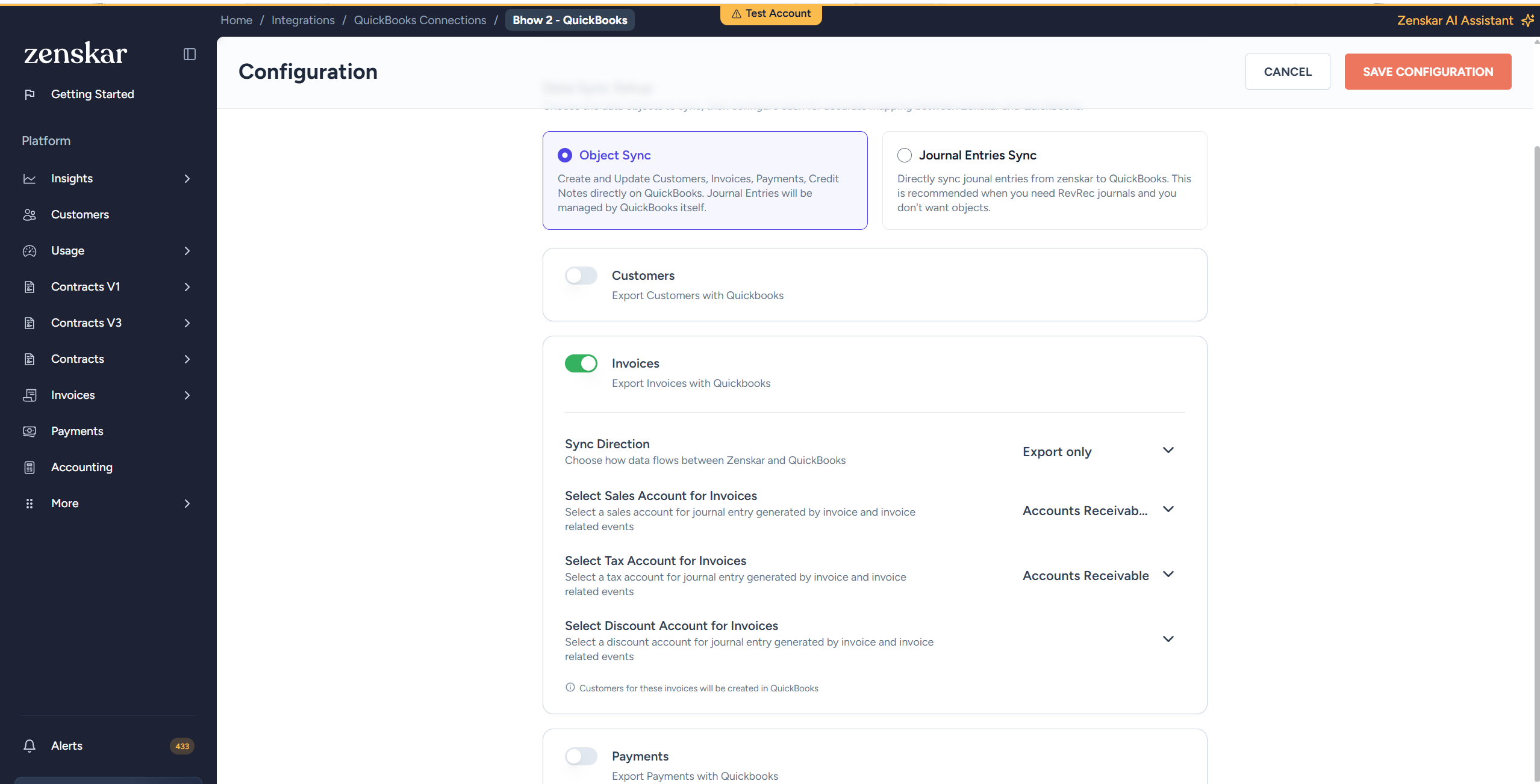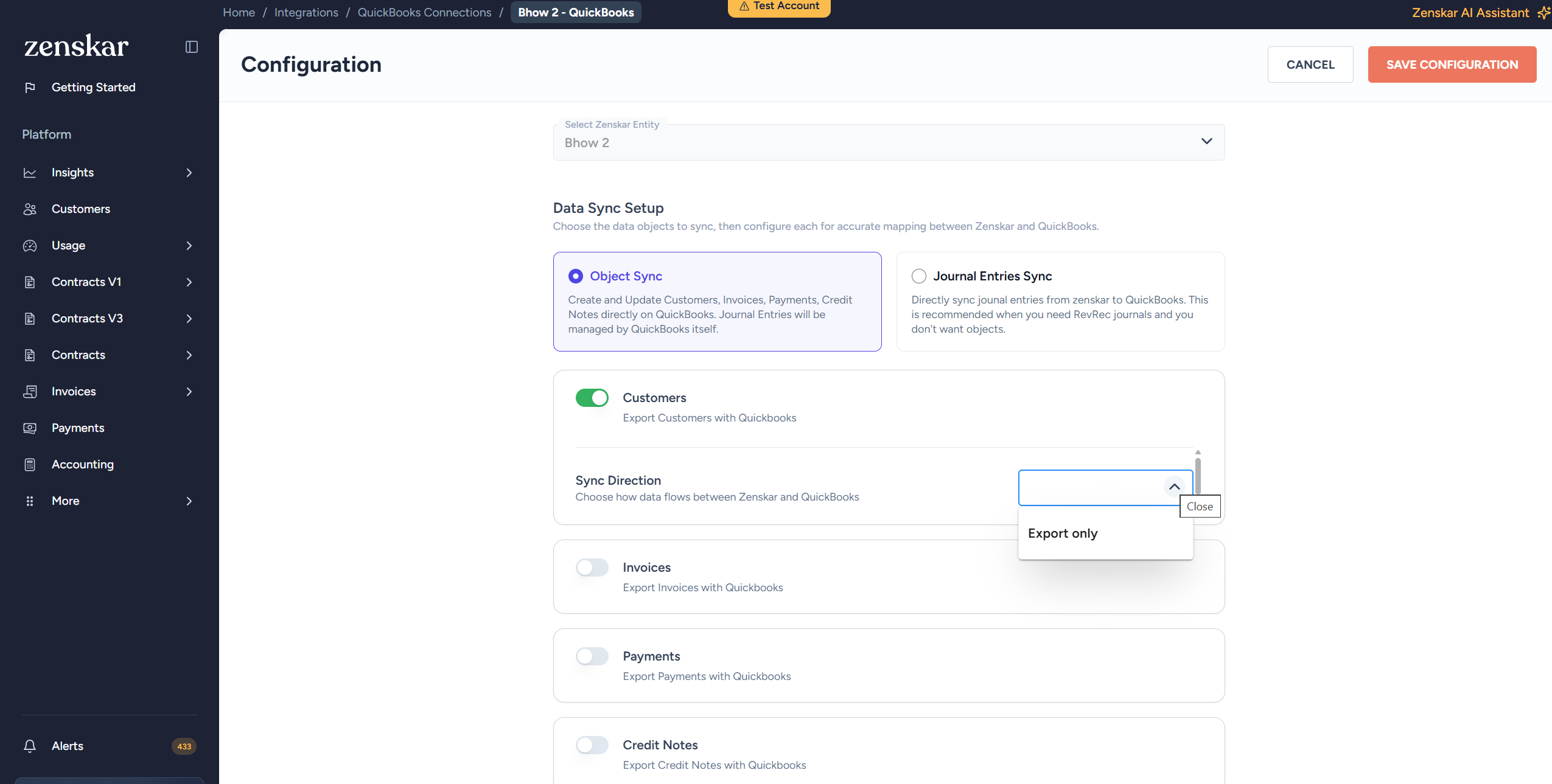 - Select the sync direction. Exports invoices from Zenskar to QuickBooks with line items, tax details, and due dates. A link back to the Zenskar invoice is included in the private notes field.