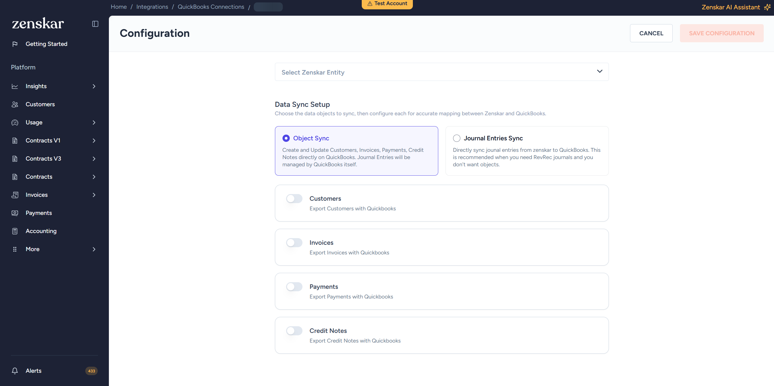 - Select Zenskar Entity and Data sync setup.
