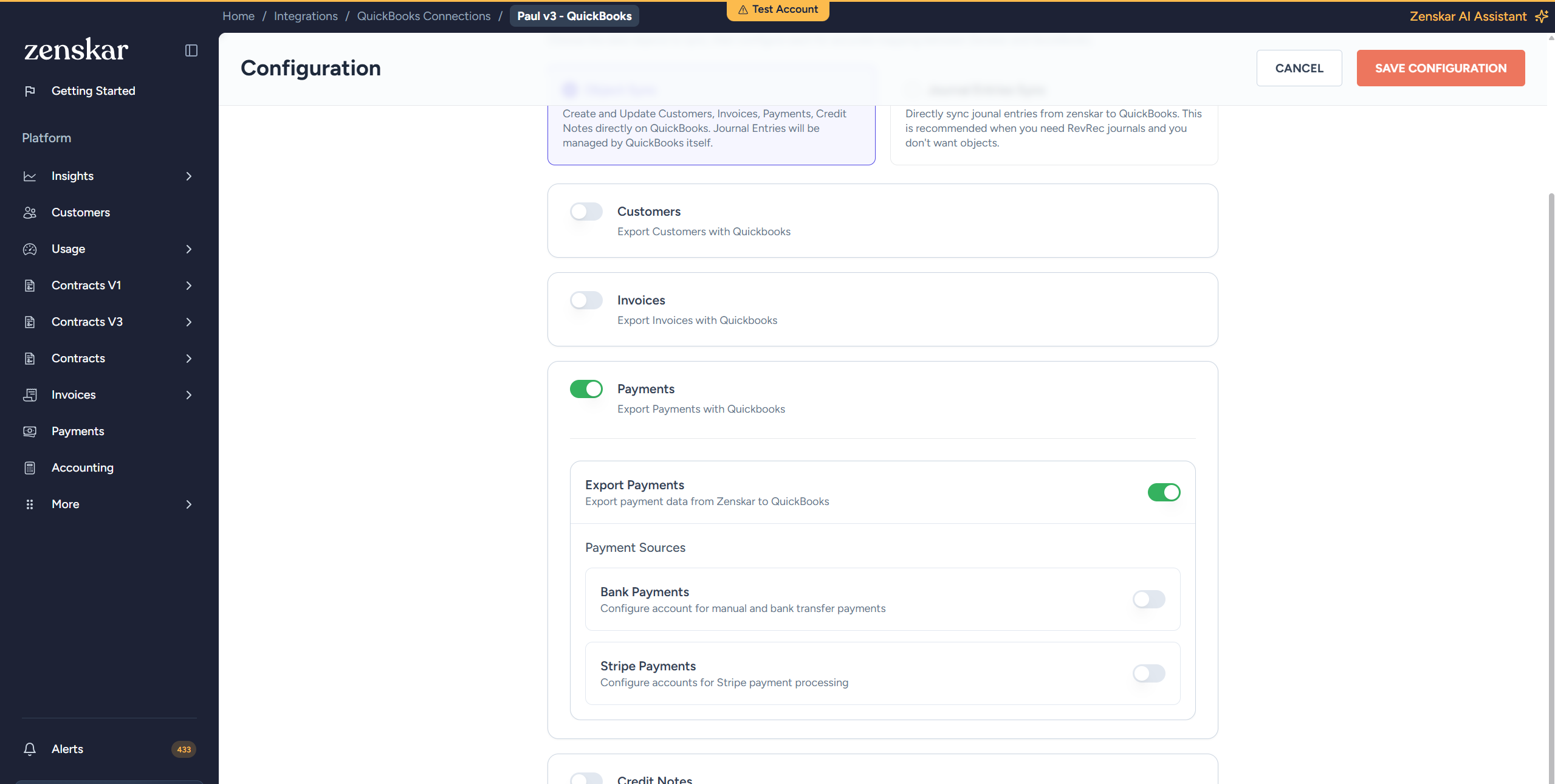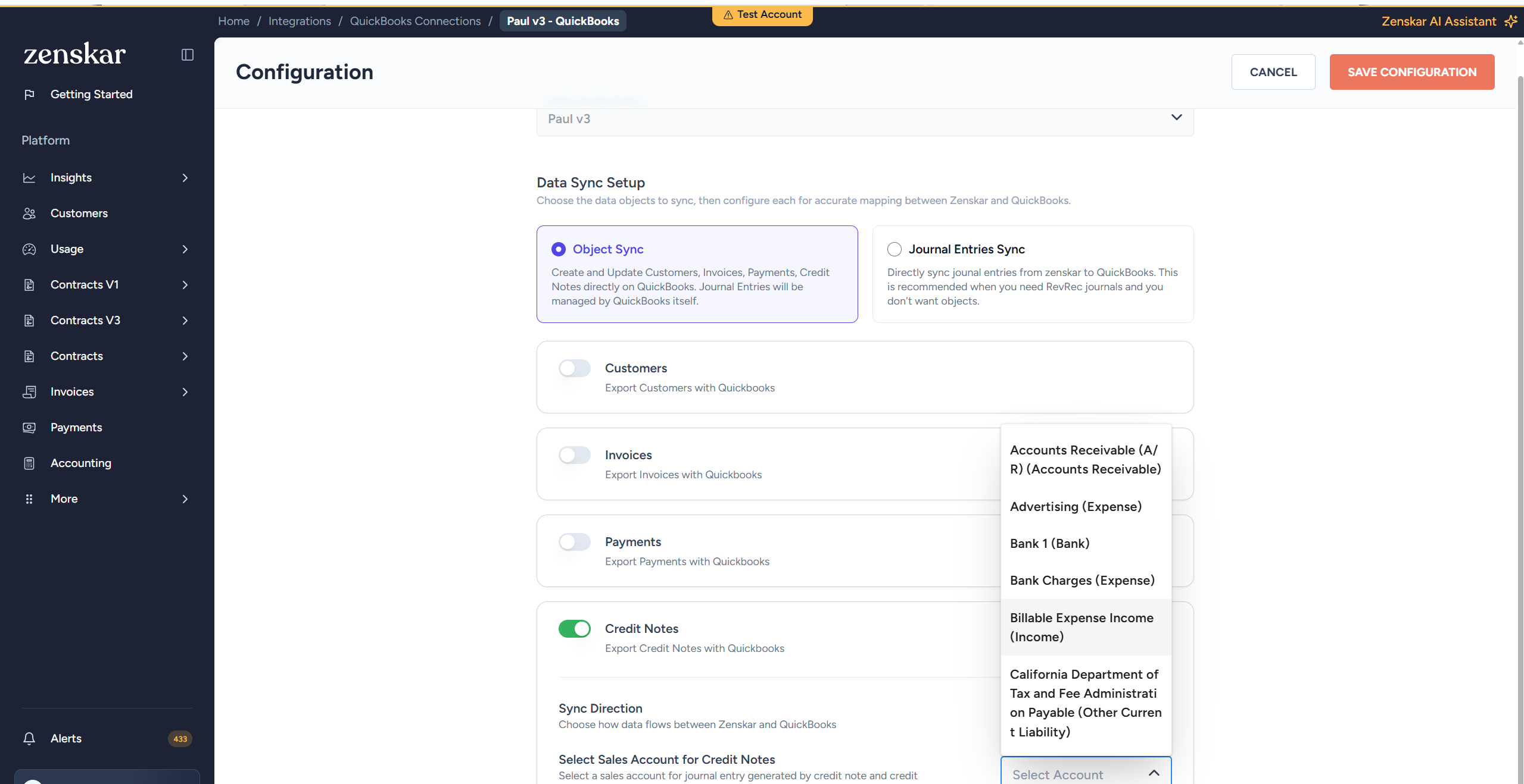 - Select the sync direction. Exports credit notes from Zenskar as Credit Memos in QuickBooks. If the original invoice is unpaid, the credit memo is automatically applied against it.