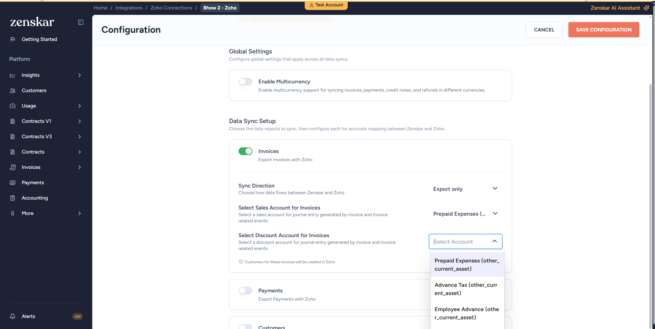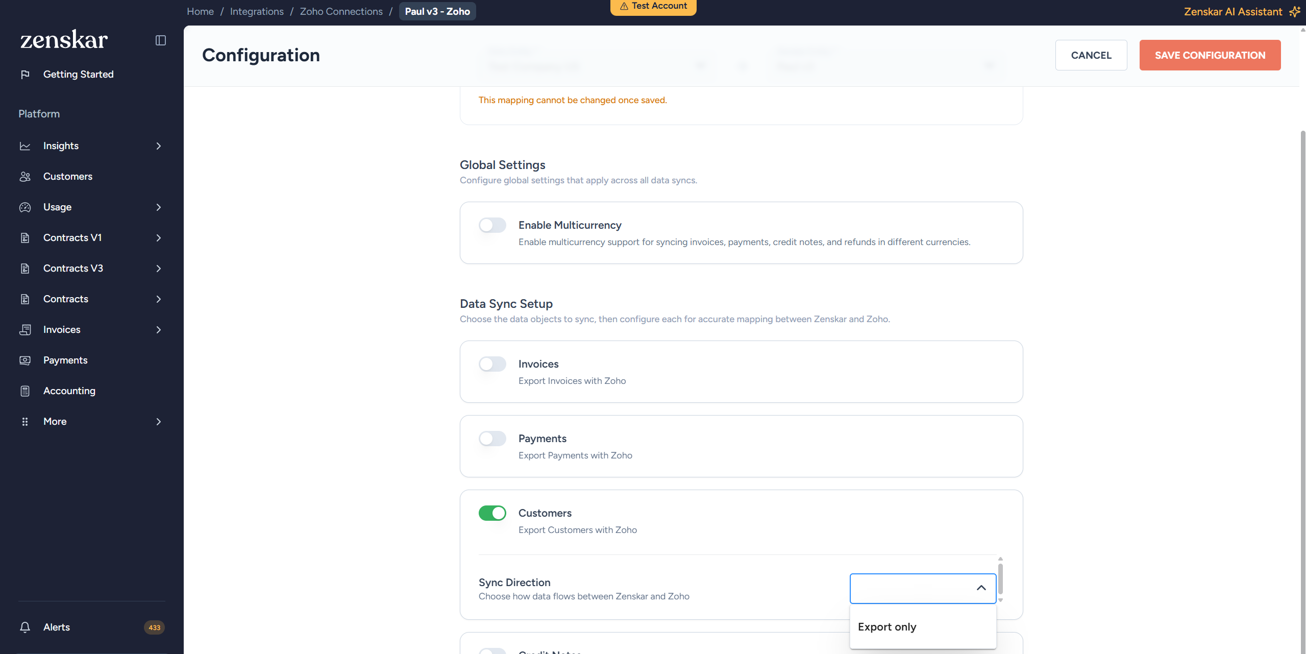 - Select the sync direction. Exports invoices from Zenskar to Zoho Books with line items, tax details, and due dates.