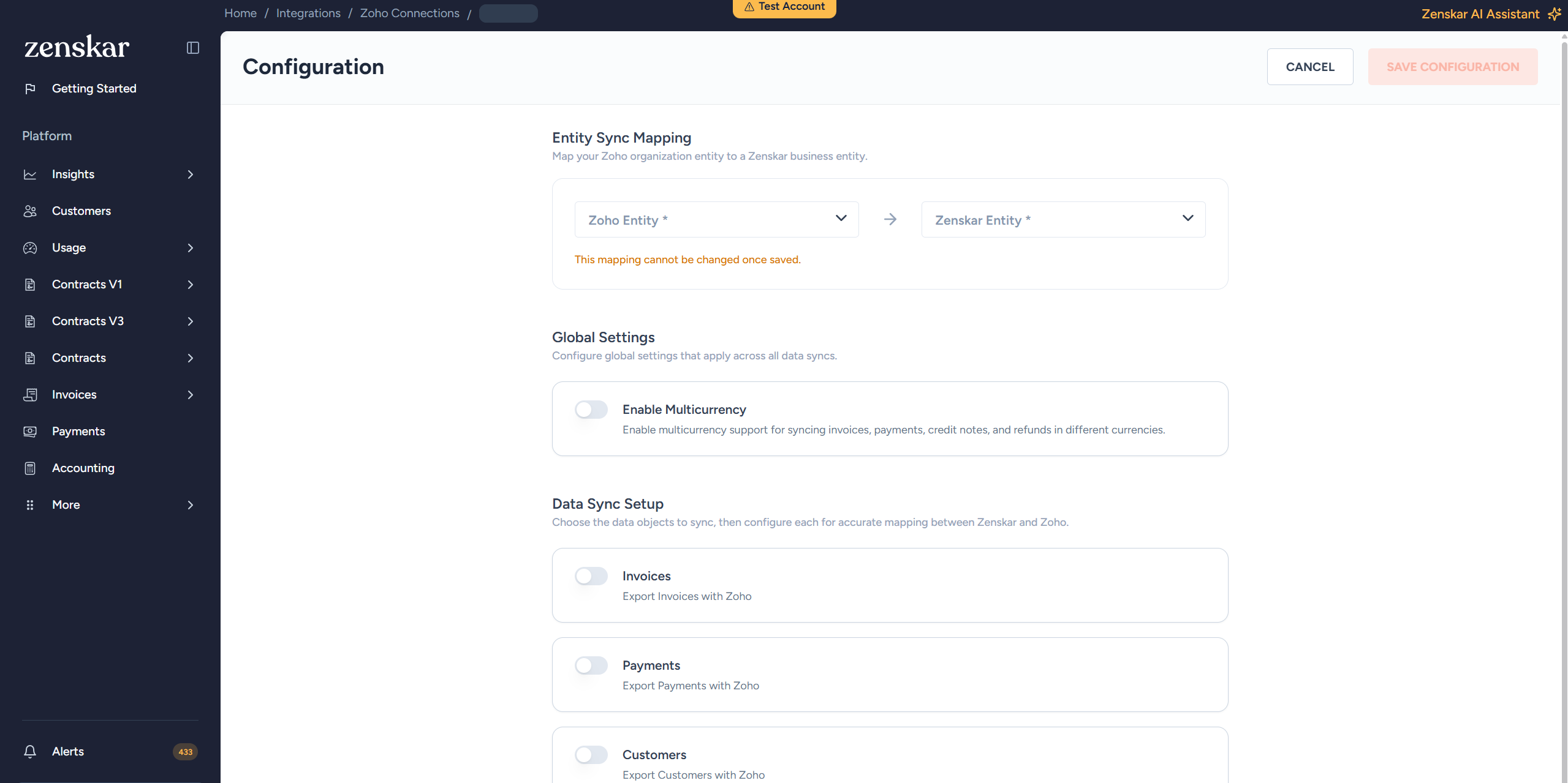 - Map your Zoho organization entity to the corresponding Zenskar business entity, then enable the modules you want to sync with Zoho. This scopes all synced data (customers, invoices, payments, and credit notes) to a single Zenskar entity.