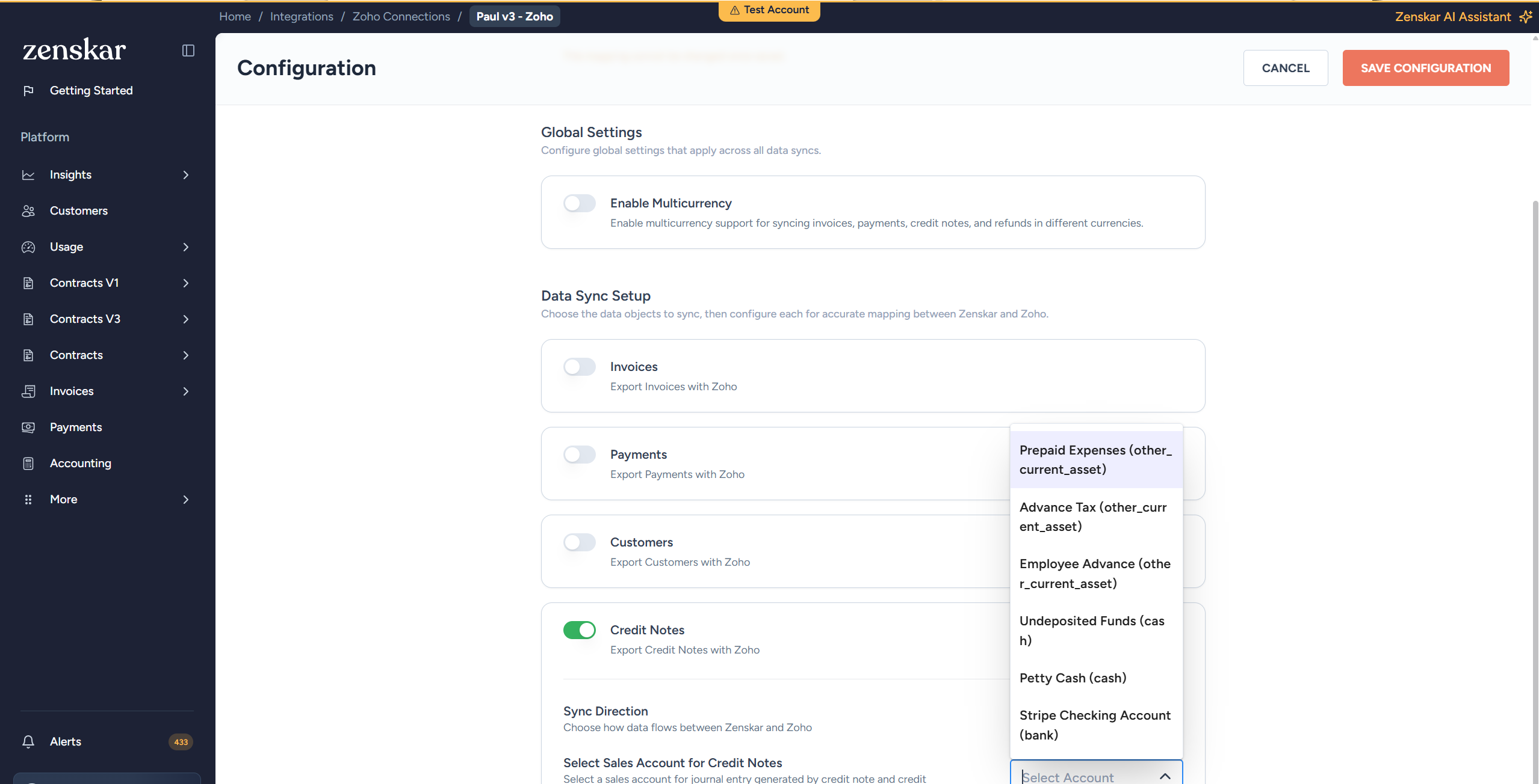 - Select the sync direction. Exports credit notes from Zenskar to Zoho Books and allocates them against the original invoice. If tax sync is enabled, tax amounts are handled automatically.