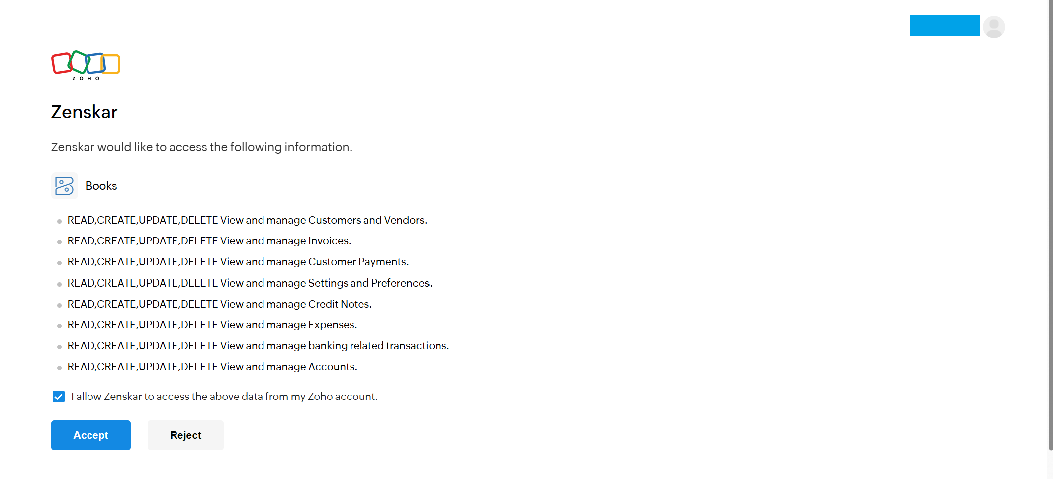 - You will be redirected to a permission page. Check the box I allow Zenskar to access the above data from my Zoho account, and then click Accept.