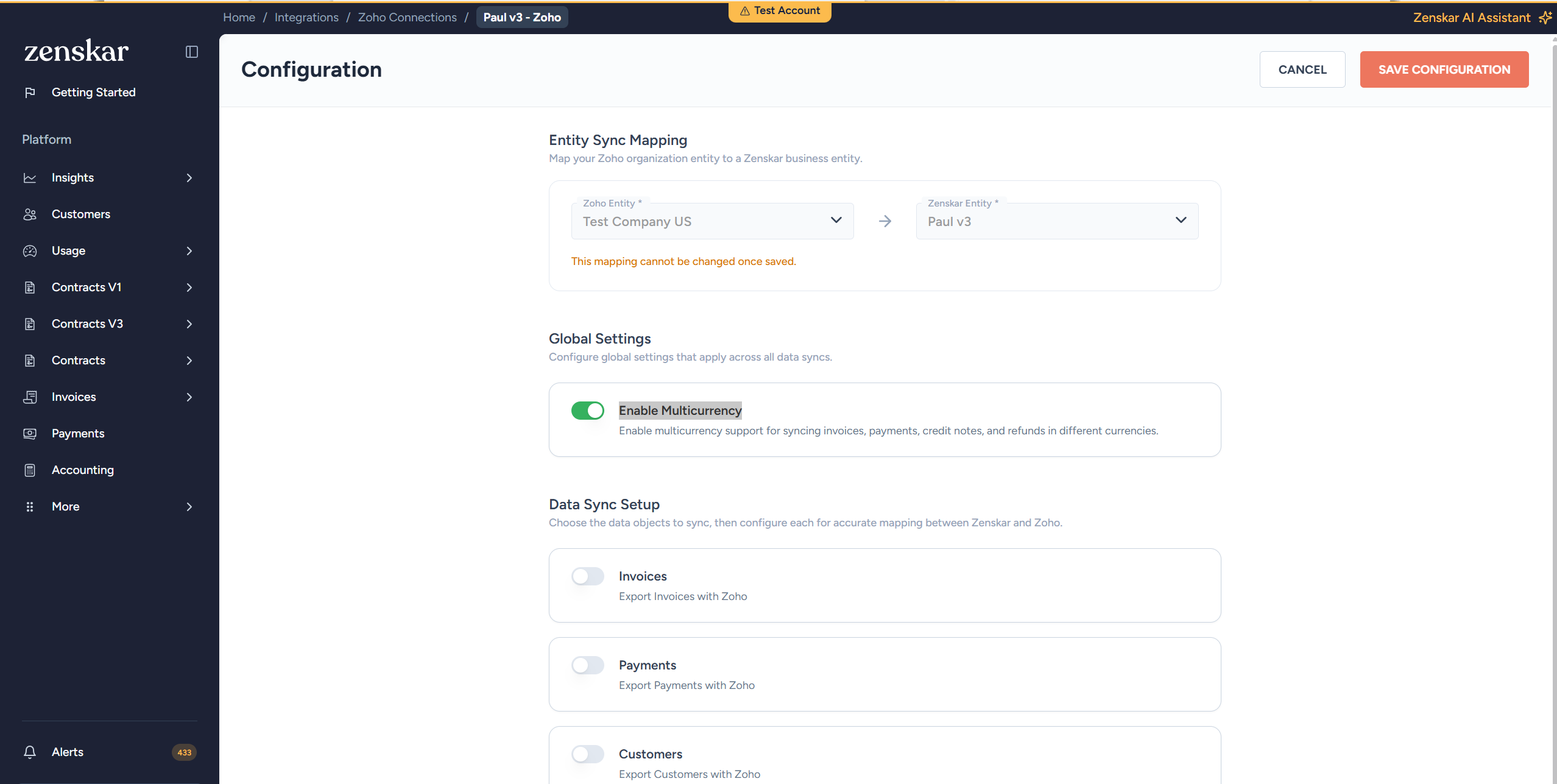 A mismatch between the Zenskar multicurrency selection and Zoho Books organization setting will cause sync failures for invoices, payments, credit notes, and refunds.