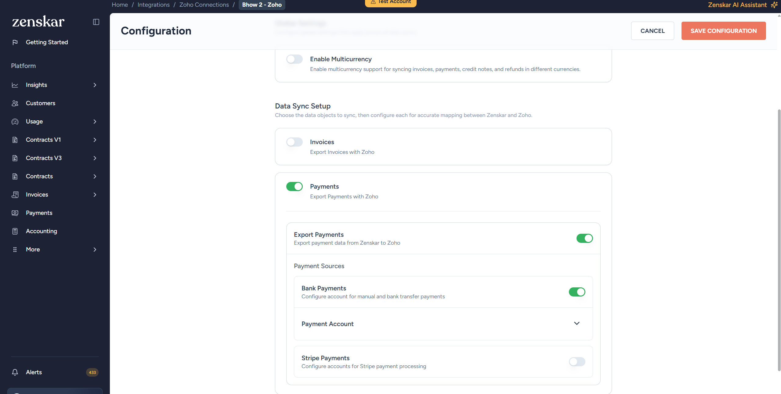 - Enable Export Payments. When enabled, payment records from Zenskar are created in Zoho Books and allocated against their corresponding invoices. Gateway fees (e.g., Stripe fees) are recorded as separate expenses.